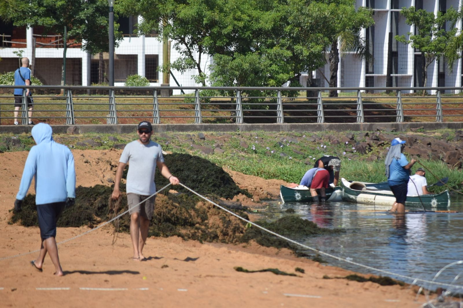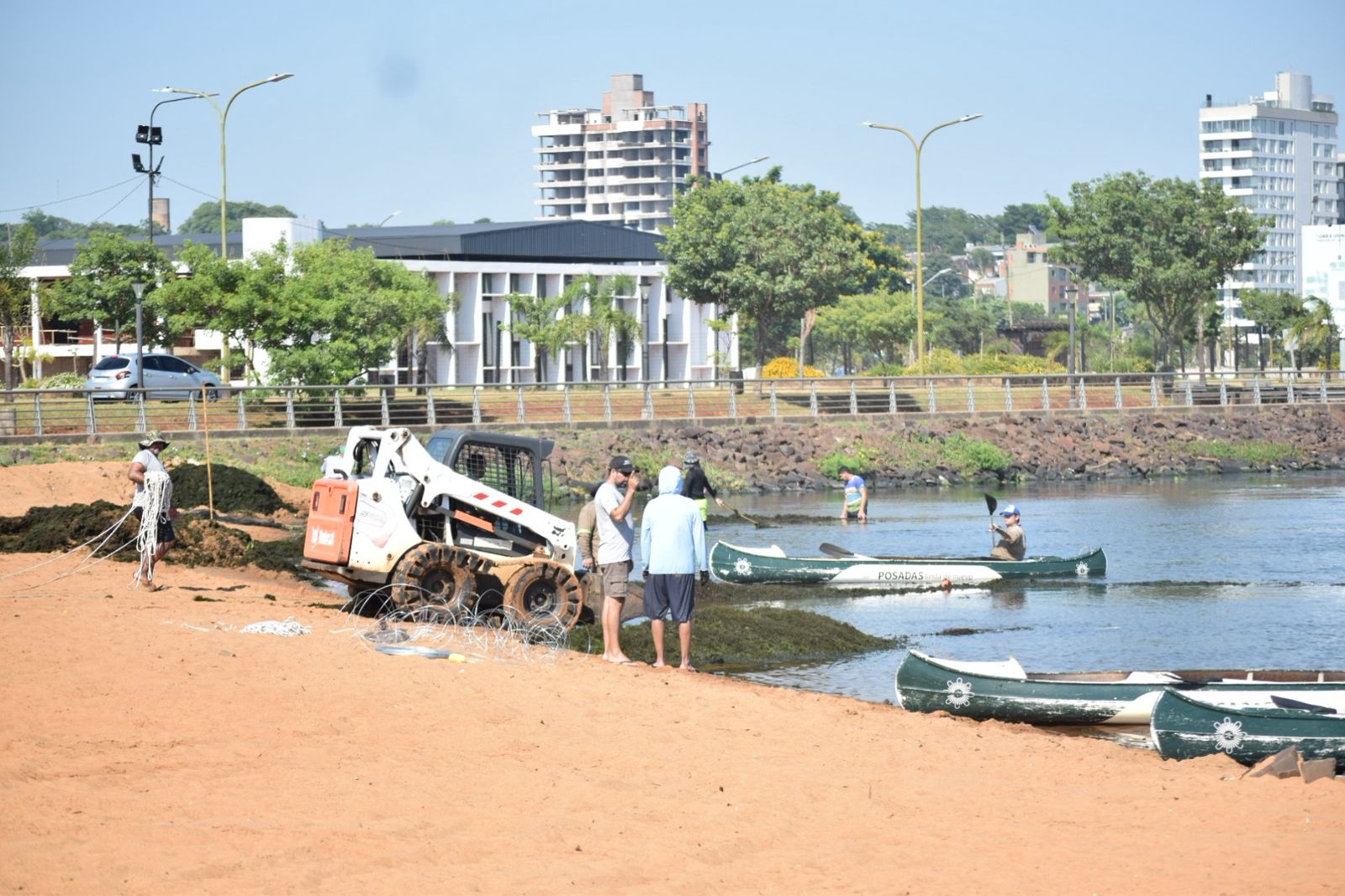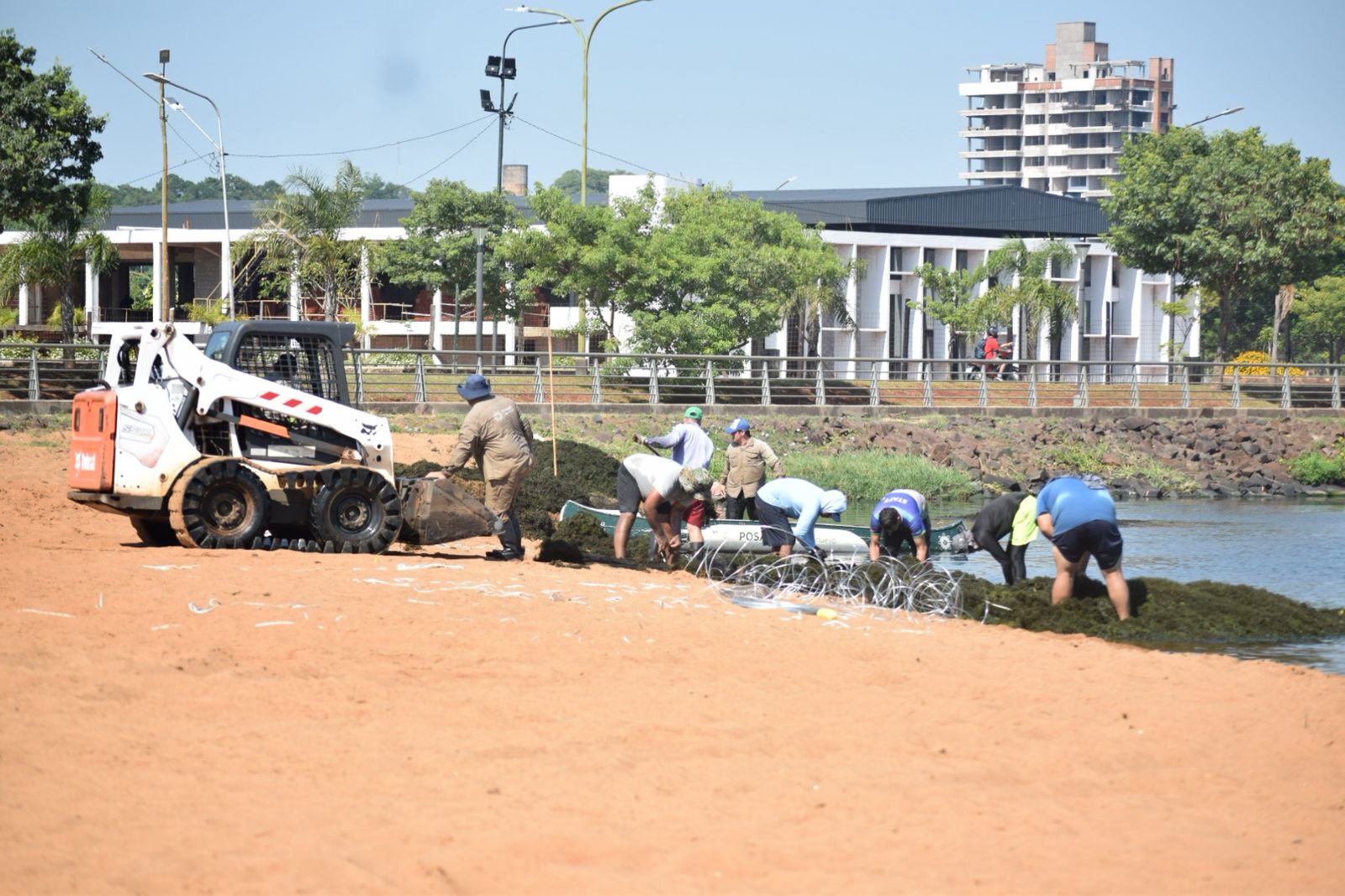 Equipos de trabajo de la Municipalidad de Posadas desarrollan acciones para liberar de algas a la zona cercana a la bahía El Brete. Recomiendan que ante cualquier coloración inusual y malos olores a la orilla se debe evitar el contacto con el agua.